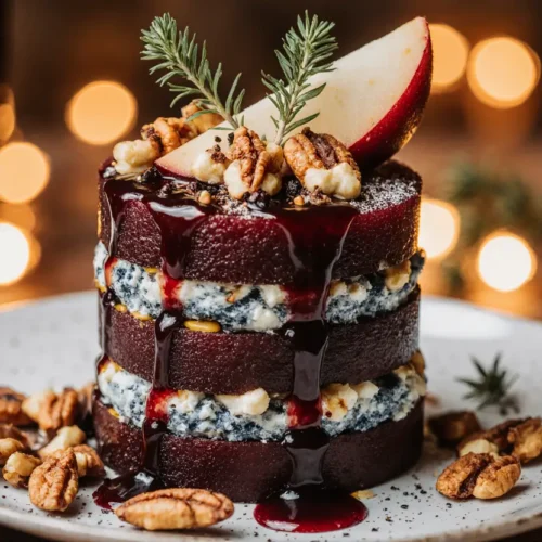 Elegant Dinner Parties: Serve towers as a plated first course on white porcelain plates, allowing the vibrant beet color to create maximum visual impact. Pair with a crisp Sauvignon Blanc or sparkling Prosecco—the acidity cuts through the richness of blue cheese while complementing the beets’ earthiness.