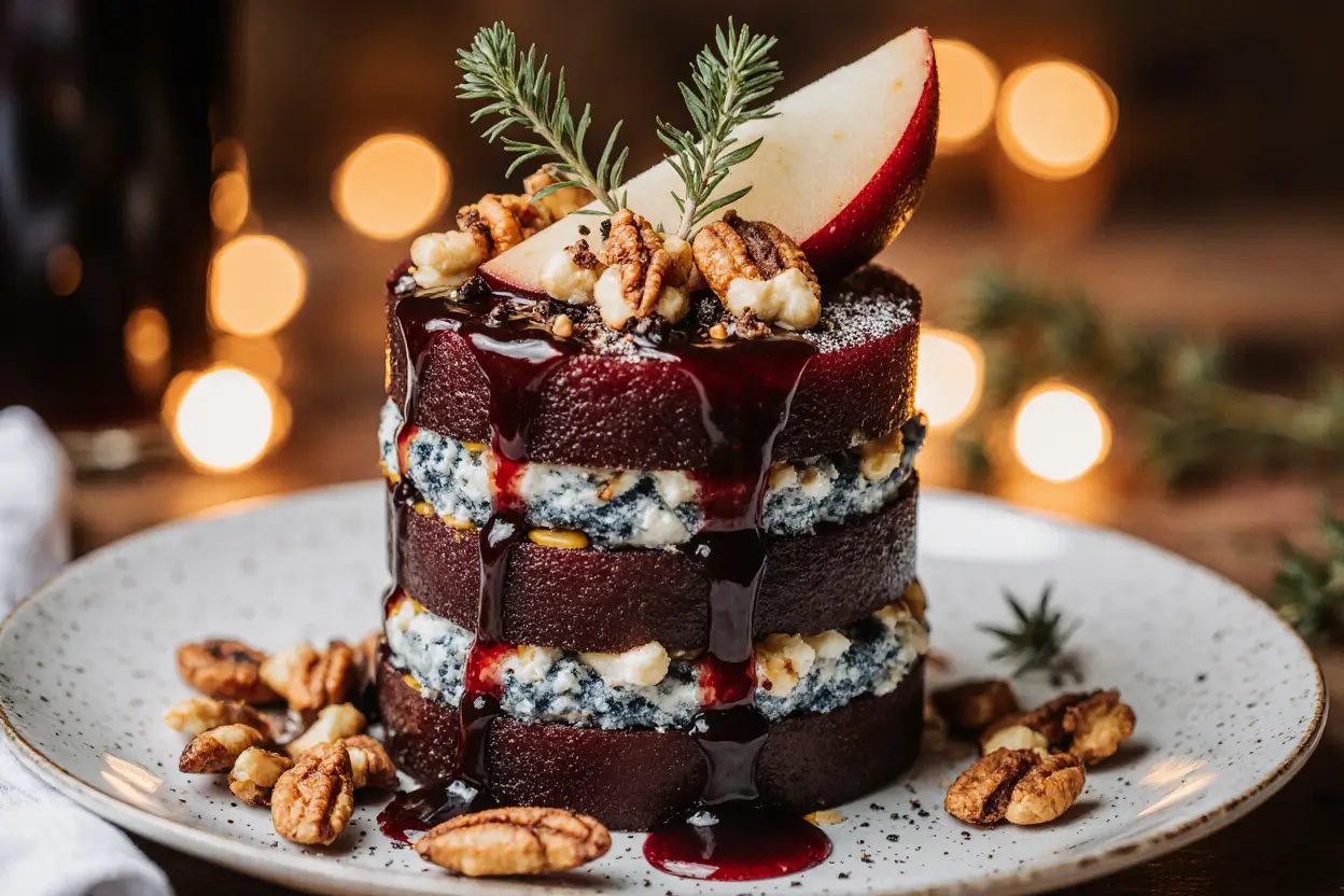 Pair these towers with herb-crusted lamb chops, grilled ribeye steak, or pan-seared duck breast. The robust flavors of red meat complement the earthy beets and pungent cheese beautifully. For lighter options, serve alongside herb-roasted chicken or grilled salmon.
