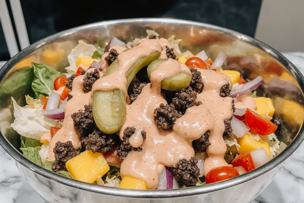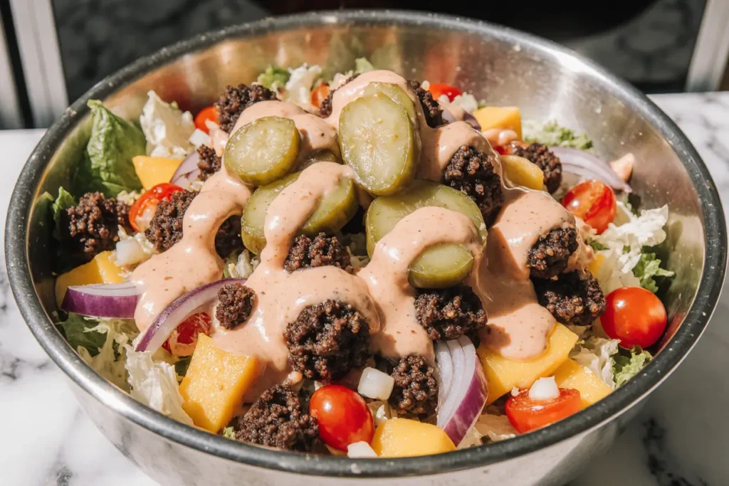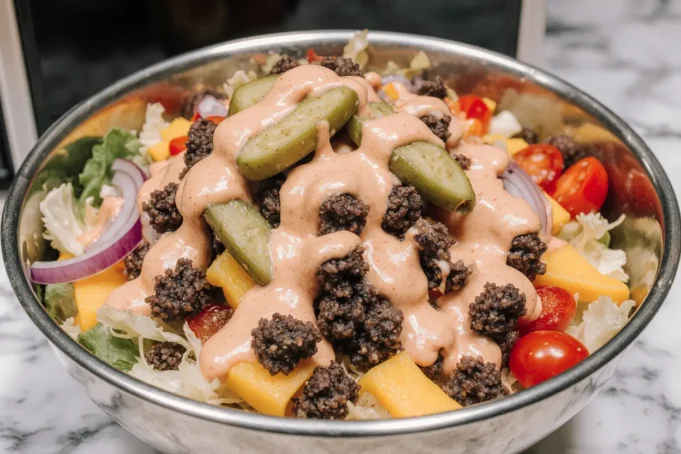 The Big Mac Salad takes everything you love about McDonald’s legendary sandwich and transforms it into a nutrient-dense, satisfying meal that doesn’t compromise on flavor. This description of the perfect low-carb alternative combines crispy lettuce, seasoned ground beef, tangy pickles, sharp cheddar cheese, and that signature special sauce—all without the bun. Whether you’re following a keto diet, counting calories, or simply looking for a more nutritious way to satisfy your fast-food cravings, this recipe delivers on every level.