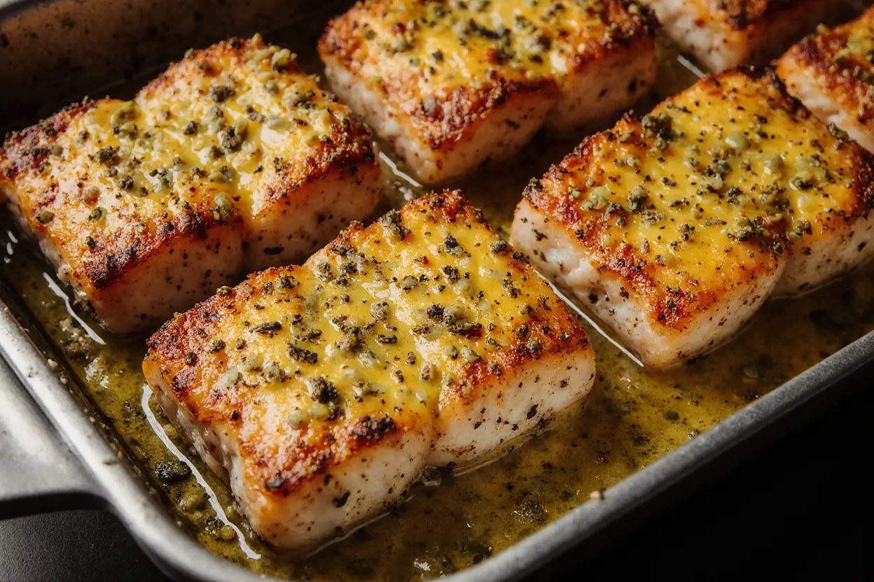 Remove from oven and immediately brush with remaining glaze. Garnish with fresh parsley, lemon zest, and serve with lemon wedges for brightness.