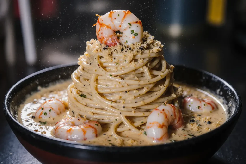 Nestle the seared shrimp back into the pasta, allowing them to warm through for 1-2 minutes. Don’t stir aggressively—you want to maintain the shrimp’s beautiful sear. Now for the dramatic presentation: using tongs, twirl a generous portion of pasta into a high mound in the center of warmed serving bowls or a large platter. Arrange the shrimp on top and cascading down the sides, creating that “volcano” effect with shrimp as the lava flow. Drizzle any remaining sauce around the base. Garnish generously with chopped fresh parsley and sliced green onions for a pop of color. Serve immediately while piping hot.