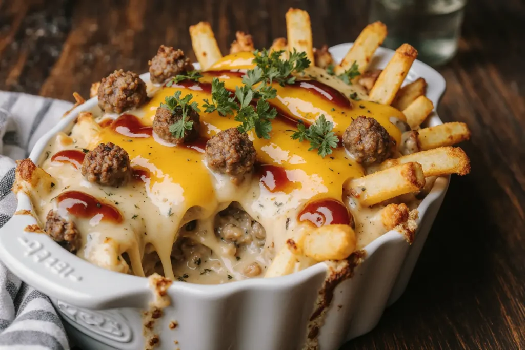 This innovative casserole description captures the essence of comfort food innovation: layers of seasoned ground beef reminiscent of your favorite burger patty, melted cheese that stretches with every serving, and crispy-edged french fries that maintain their addictive crunch even when baked into a casserole. Whether you’re feeding hungry teenagers after soccer practice, hosting a casual game-day gathering, or simply craving nostalgic flavors with minimal cleanup, this recipe delivers maximum impact with surprisingly straightforward preparation. The beauty lies in its adaptability—you can customize every layer to match your family’s preferences while maintaining the core appeal that makes this dish universally beloved.
