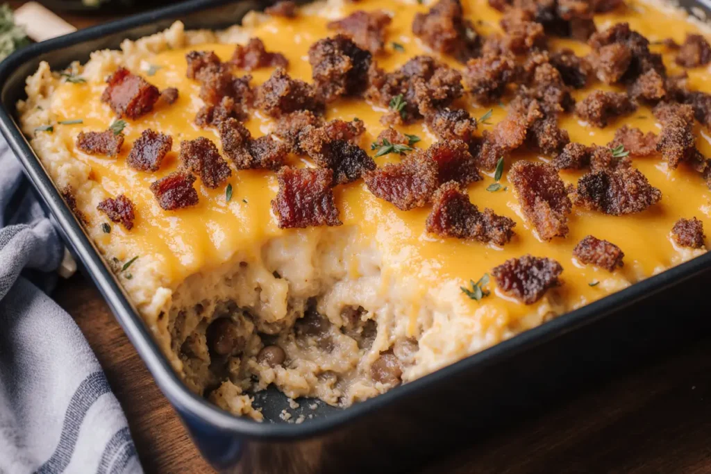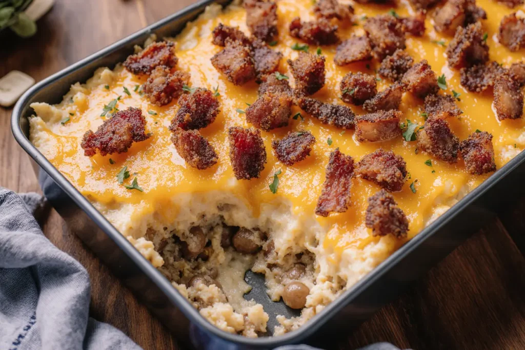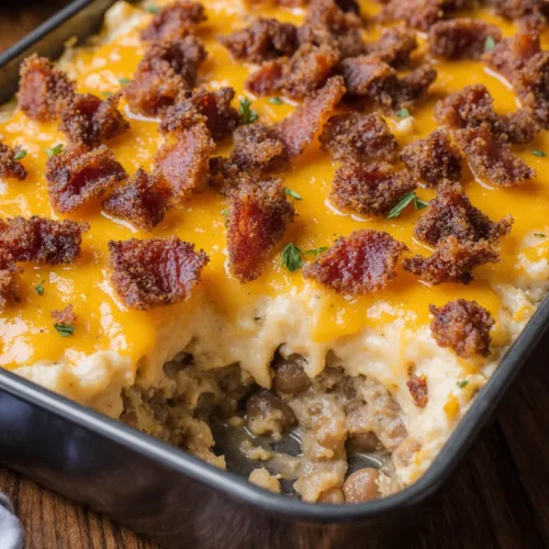For the final layer, top with the remaining 2 cups of mozzarella cheese, 1/2 cup of Parmesan, 1/2 cup of cheddar, and the reserved crispy bacon pieces. This triple-cheese topping creates a golden, bubbly crust that delivers that signature burger-lasagna fusion in every bite.