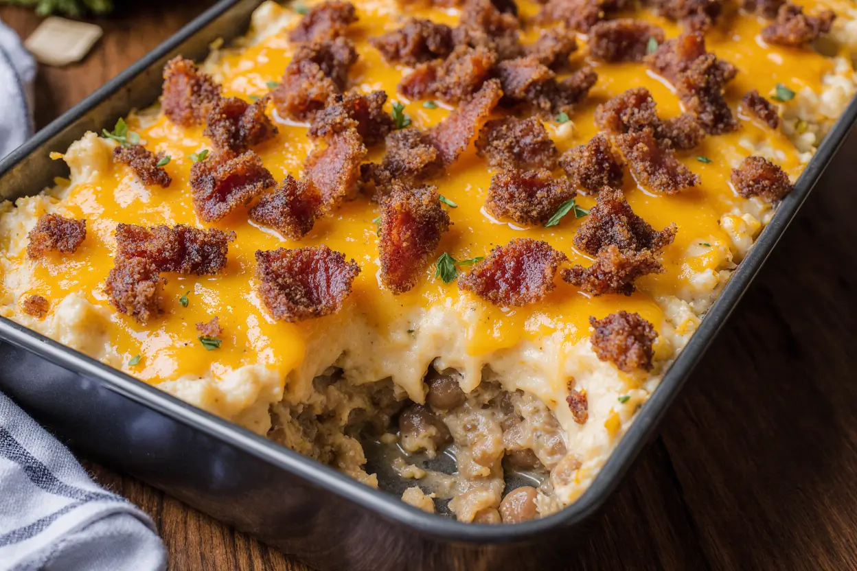 For the final layer, top with the remaining 2 cups of mozzarella cheese, 1/2 cup of Parmesan, 1/2 cup of cheddar, and the reserved crispy bacon pieces. This triple-cheese topping creates a golden, bubbly crust that delivers that signature burger-lasagna fusion in every bite.