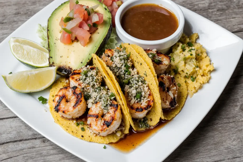Classic Mexican Street Style: Serve on small corn tortillas with only cilantro, diced white onion, and lime wedges—this minimalist approach highlights the shrimp’s flavor complexity and mirrors authentic taqueria presentation. Accompany with pickled jalapeños and multiple hot sauce options for customizable heat levels.