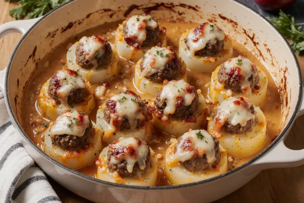The ingredient selection focuses on creating layers of flavor and texture. The potatoes provide a starchy, comforting base that absorbs the creamy sauce, while the meatballs offer protein-packed satisfaction with aromatic seasonings that permeate every bite.