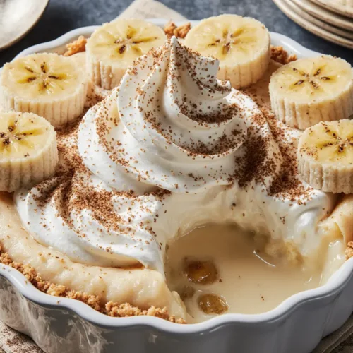 Spread or pipe the whipped cream over the top layer of custard, creating decorative swirls if desired. Garnish with additional vanilla wafers, banana slices, or a light dusting of vanilla wafer crumbs for an elegant finish.