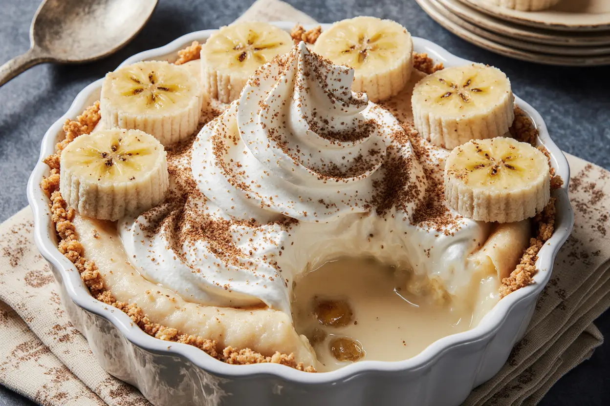 Spread or pipe the whipped cream over the top layer of custard, creating decorative swirls if desired. Garnish with additional vanilla wafers, banana slices, or a light dusting of vanilla wafer crumbs for an elegant finish.