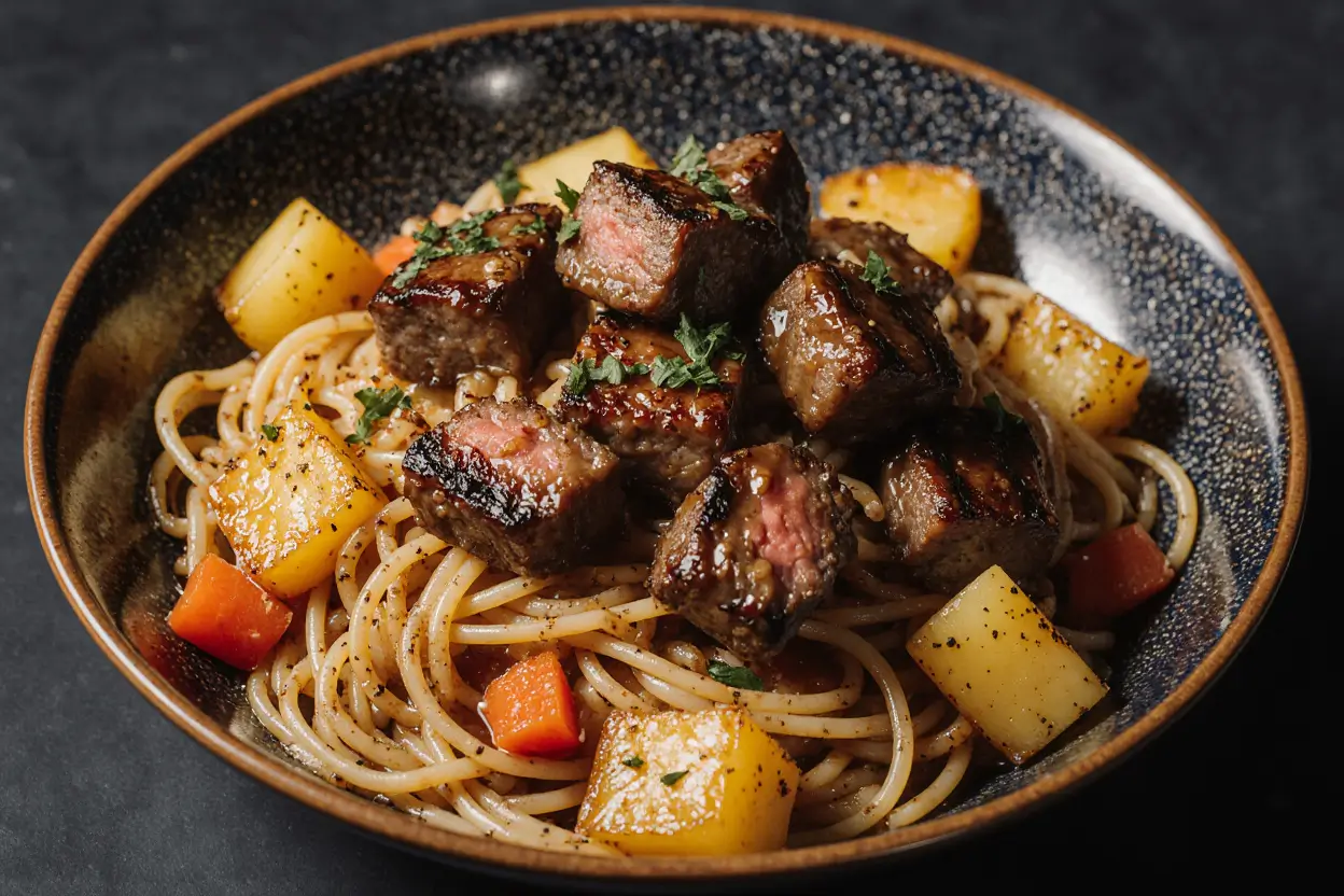 Begin by organizing all ingredients within arm’s reach—this French culinary principle of “everything in its place” reduces cooking time by 22% according to culinary efficiency studies. Pat the steak cubes completely dry with paper towels; this crucial step ensures proper caramelization rather than steaming. Season generously with salt and pepper on all sides. Mince your garlic fresh rather than using pre-minced, as fresh garlic contains 40% more aromatic compounds. Bring a large pot of water (at least 4 quarts) to a rolling boil for the pasta.