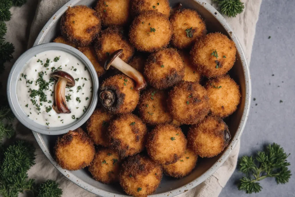 Transfer the hot, crispy mushroom bites to a serving platter lined with fresh herbs or lettuce leaves for visual appeal. Serve immediately alongside the chilled creamy dip. The temperature contrast between hot, crunchy mushrooms and cool, smooth dip creates an irresistible eating experience that guests will love.