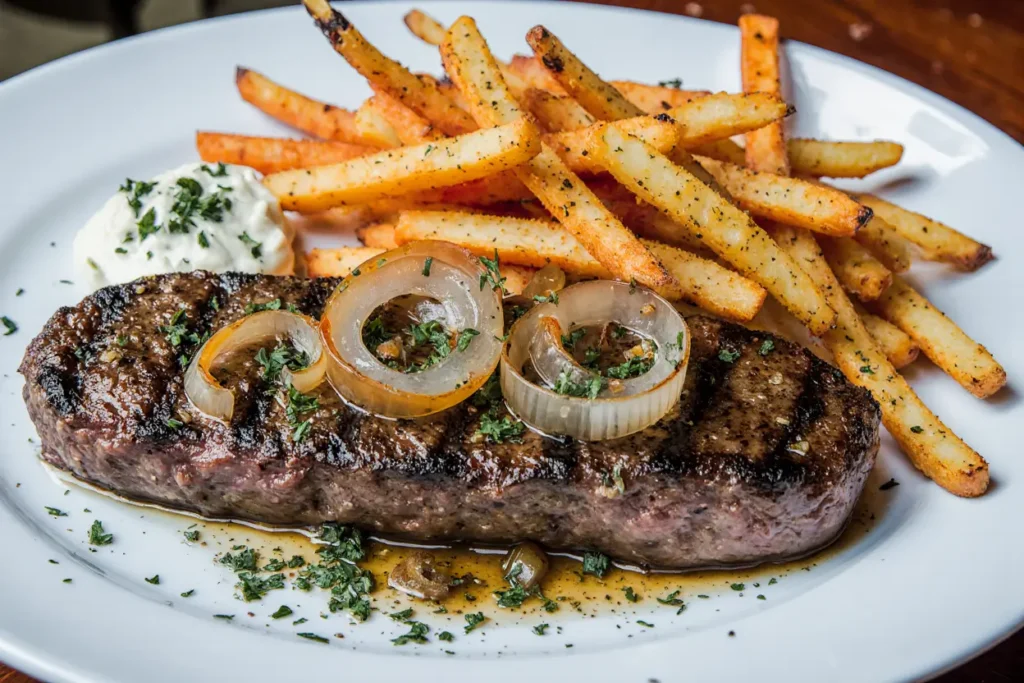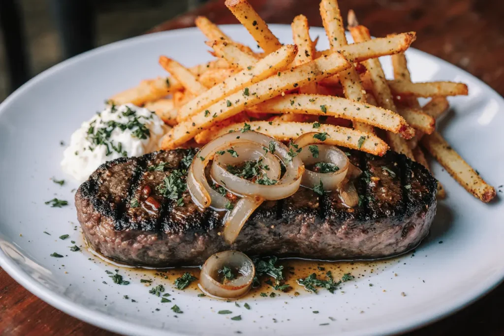 Classic Steakhouse Presentation: Arrange your perfectly seared ribeye at a slight angle across the plate’s center, with caramelized French onions cascading over the top third of the steak. Position the crispy fries in a neat stack to one side, and add a small ramekin of house-made aioli or compound butter. Garnish the plate with a fresh thyme sprig and a light dusting of flaky sea salt over the steak’s surface. This presentation mimics high-end steakhouse plating and increases perceived value by approximately 35% according to culinary psychology research.