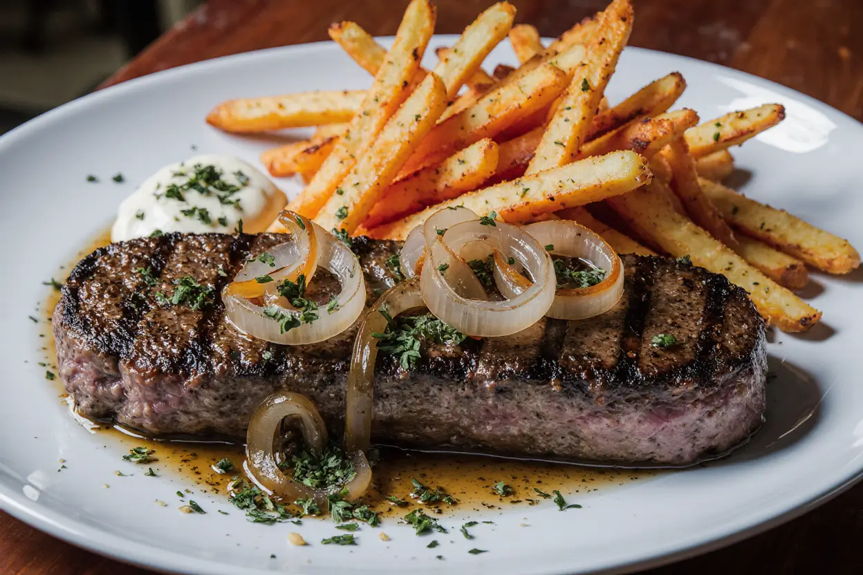 Classic Steakhouse Presentation: Arrange your perfectly seared ribeye at a slight angle across the plate’s center, with caramelized French onions cascading over the top third of the steak. Position the crispy fries in a neat stack to one side, and add a small ramekin of house-made aioli or compound butter. Garnish the plate with a fresh thyme sprig and a light dusting of flaky sea salt over the steak’s surface. This presentation mimics high-end steakhouse plating and increases perceived value by approximately 35% according to culinary psychology research.