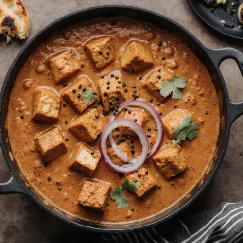 Unlike traditional versions that require overnight marination and charcoal smoking, this method streamlines the process while keeping the flavors balanced. The cashews add body to the sauce, the butter and cream provide richness, and Kashmiri chili powder gives vibrant color without overwhelming heat.