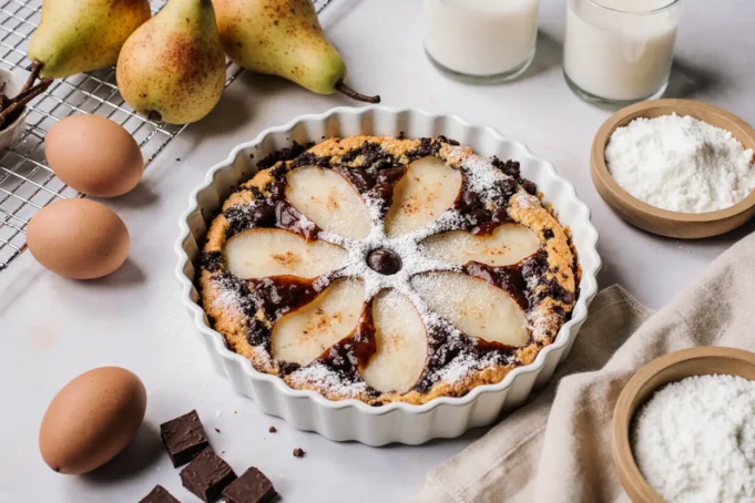 Clafoutis (pronounced kla-foo-TEE) traditionally features cherries, but pears and chocolate are a dreamy modern twist. The fruit brings gentle sweetness and moisture, while dark chocolate adds richness and depth. Best of all? You don’t need any fancy techniques or hard-to-find ingredients—just a bowl, a whisk, and a craving for something beautiful.