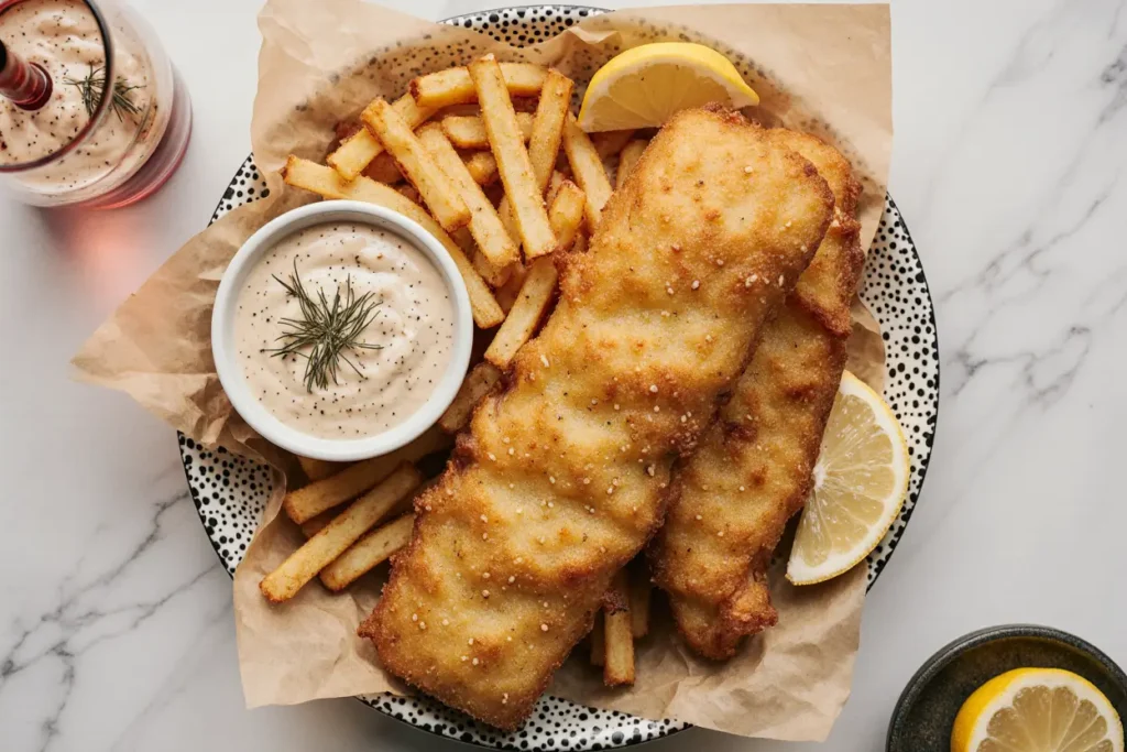Fish and chips wait for no one. Arrange your crispy fish fillets on serving plates or traditional newspaper-lined baskets. Pile hot chips alongside, ensuring they’re not underneath the fish where steam would soften their crust. Add lemon wedges, a generous dollop of tartar sauce, and a side of mushy peas if you’re embracing full British tradition.