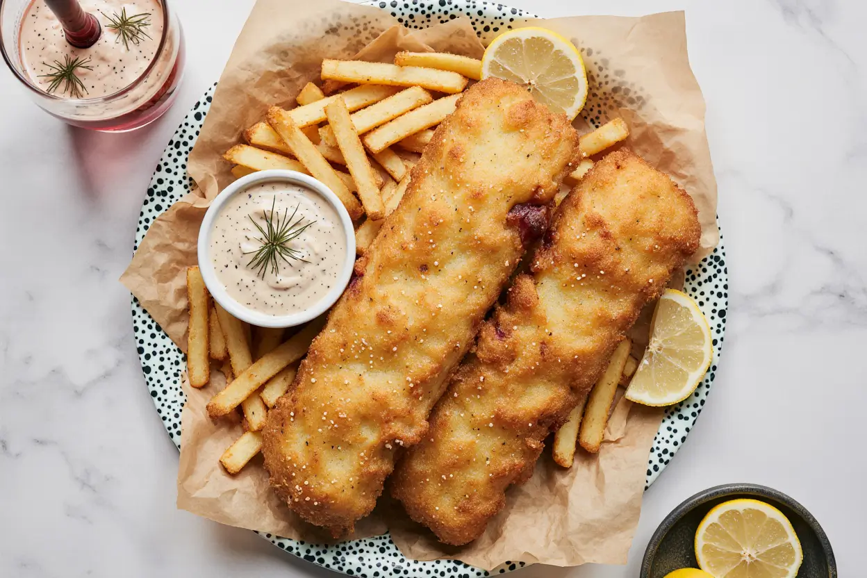 Fish and chips wait for no one. Arrange your crispy fish fillets on serving plates or traditional newspaper-lined baskets. Pile hot chips alongside, ensuring they’re not underneath the fish where steam would soften their crust. Add lemon wedges, a generous dollop of tartar sauce, and a side of mushy peas if you’re embracing full British tradition.