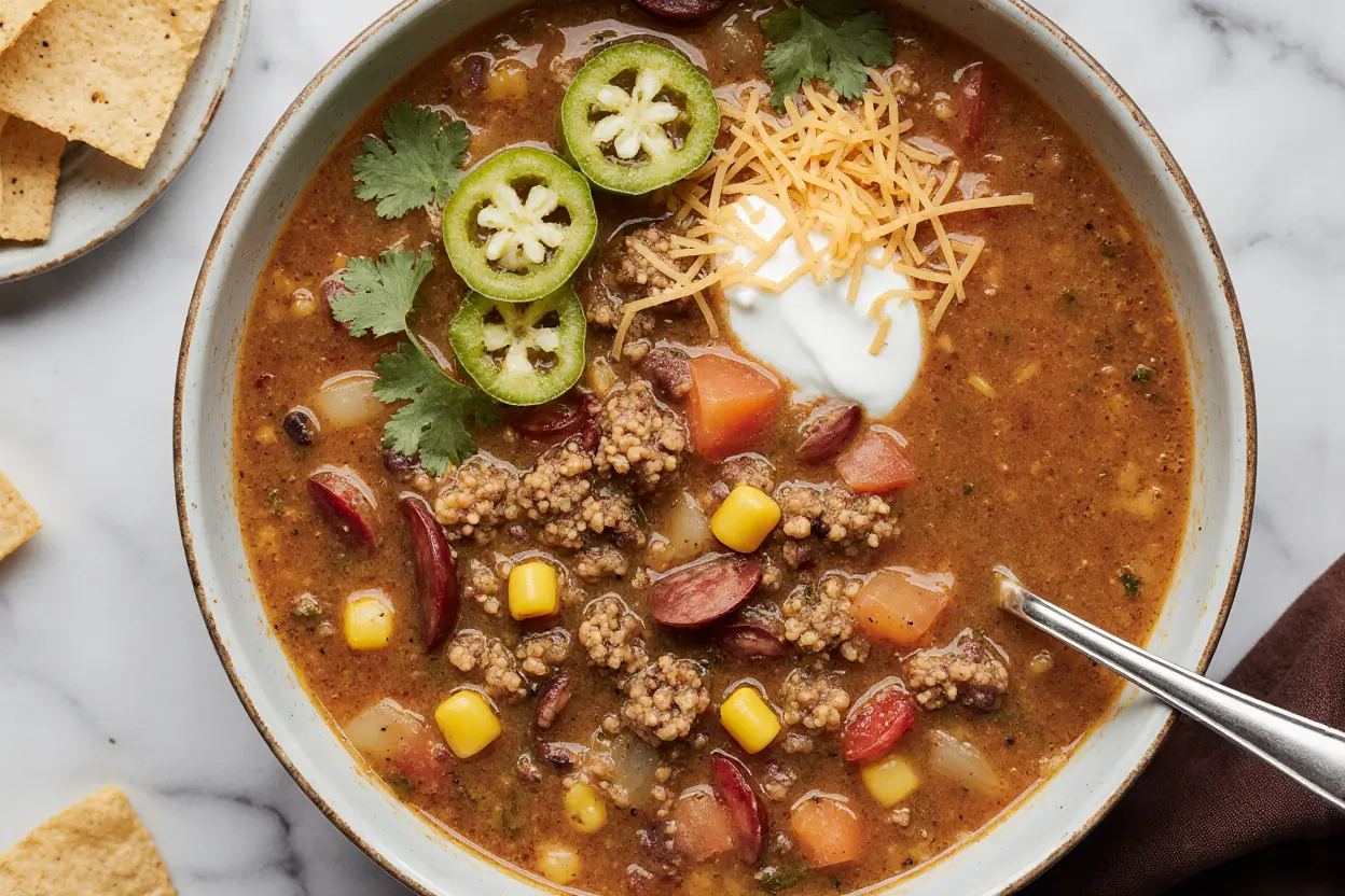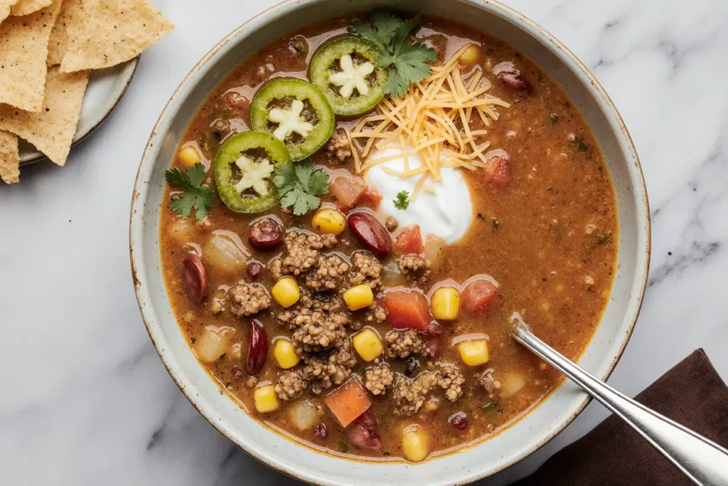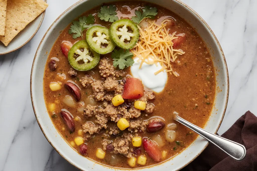 About 30 minutes before serving, give your taco soup a good stir and taste it. This is your opportunity to adjust seasonings—add more salt if needed, extra chili powder for heat, or a squeeze of lime juice to brighten the flavors. The soup should be thick and hearty, with a balanced blend of savory, spicy, and slightly sweet notes.