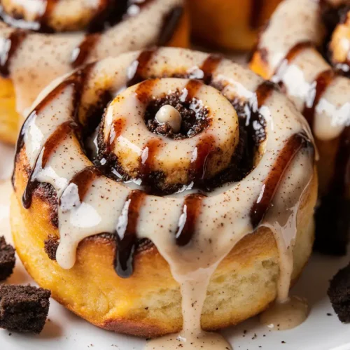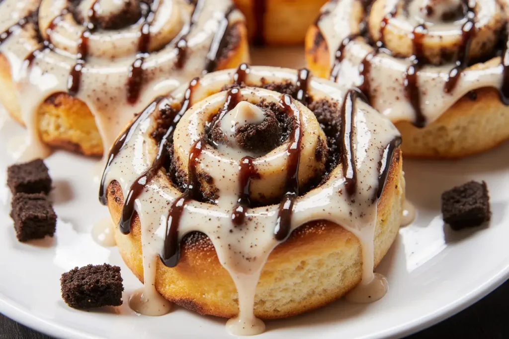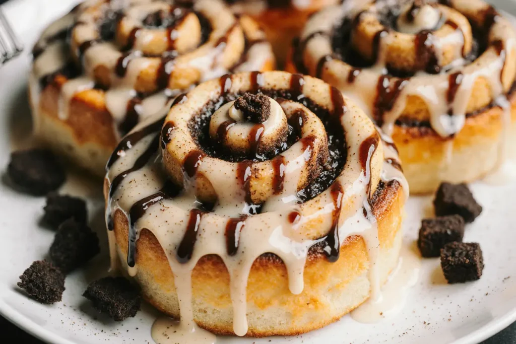 Remove the rolls from the oven and let them cool for 5 minutes—this brief rest prevents the glaze from completely melting into the rolls while they’re piping hot. Generously spread or drizzle the cookies-and-cream glaze over the warm rolls, allowing it to seep into every crevice. Sprinkle the remaining crushed Oreos over the top for visual appeal and an extra burst of chocolate flavor in every bite.