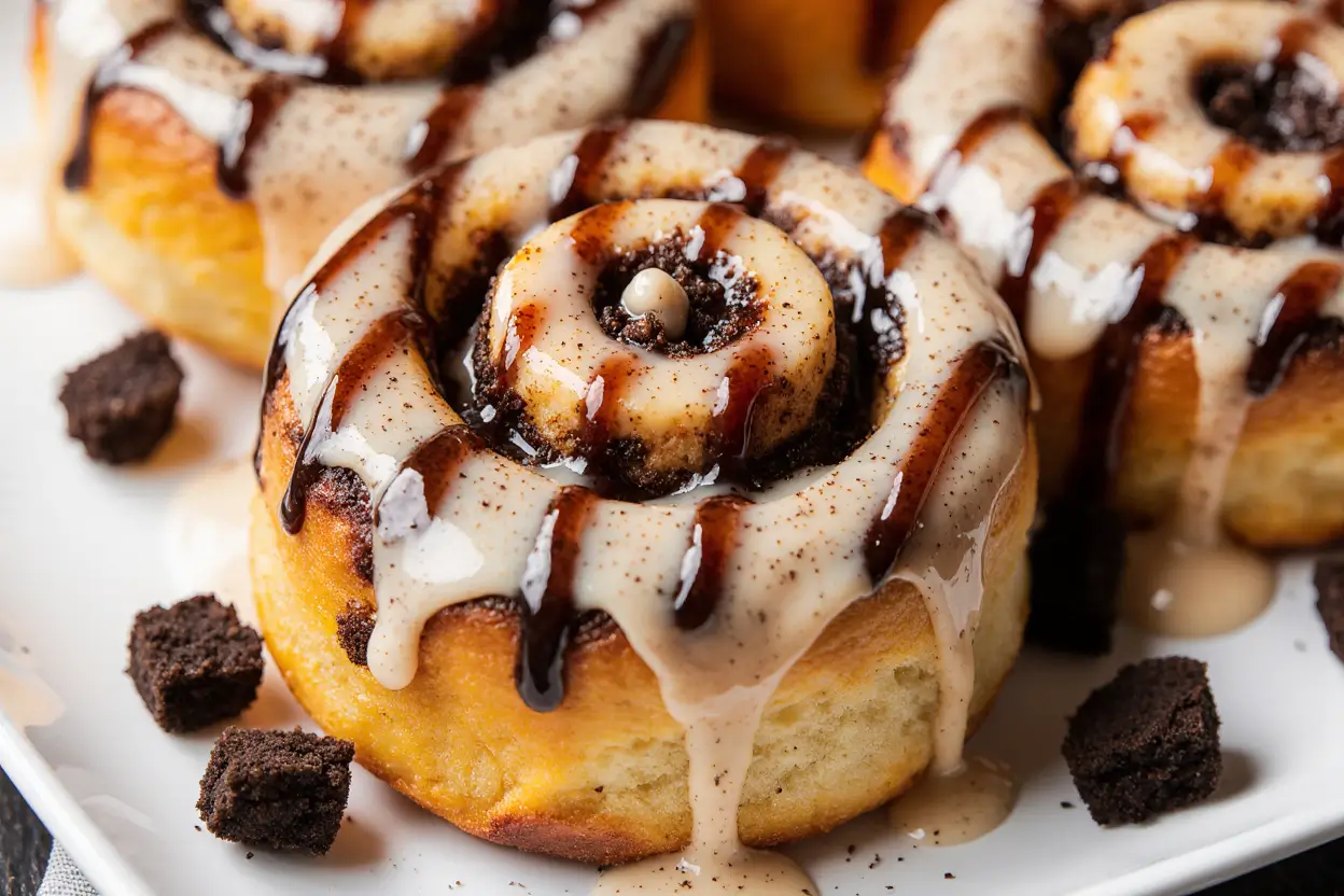 Remove the rolls from the oven and let them cool for 5 minutes—this brief rest prevents the glaze from completely melting into the rolls while they’re piping hot. Generously spread or drizzle the cookies-and-cream glaze over the warm rolls, allowing it to seep into every crevice. Sprinkle the remaining crushed Oreos over the top for visual appeal and an extra burst of chocolate flavor in every bite.