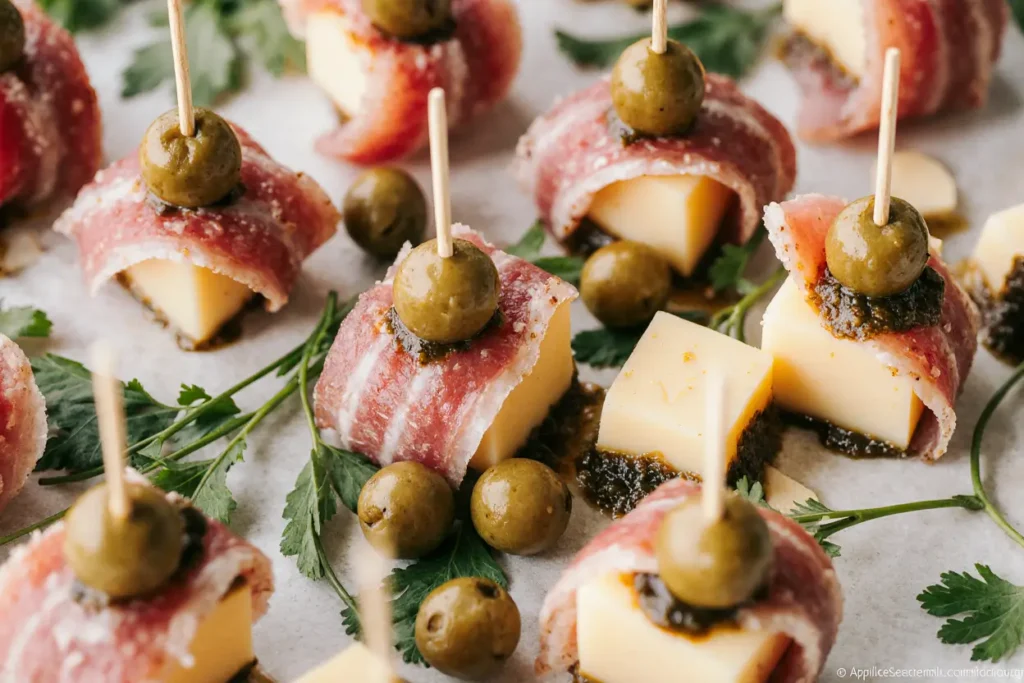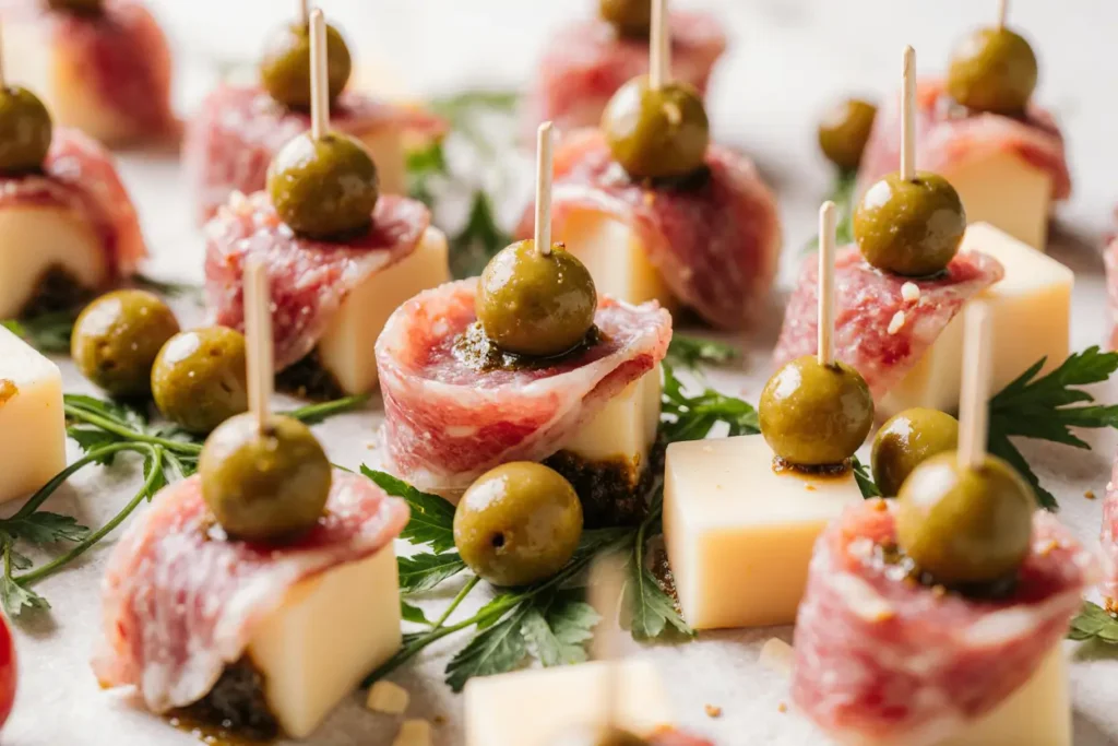 Research indicates that appetizers with odd numbers of ingredients (5 or 7 components) are perceived as more artisanal and visually appealing than even-numbered arrangements. Consider adding pickled pepperoncini, marinated mushrooms, or cubed ham for variation.