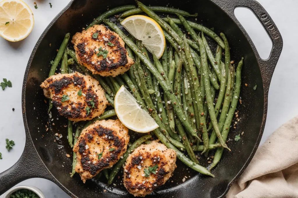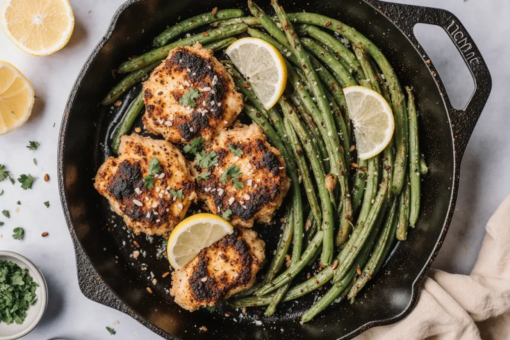 Return the rested chicken to the skillet, nestling it among the green beans. Squeeze fresh lemon juice over everything and scatter the lemon zest across the top. The citrus brightens the rich, savory flavors and adds a restaurant-quality finishing touch. Let everything warm together for 1-2 minutes, allowing the flavors to meld.