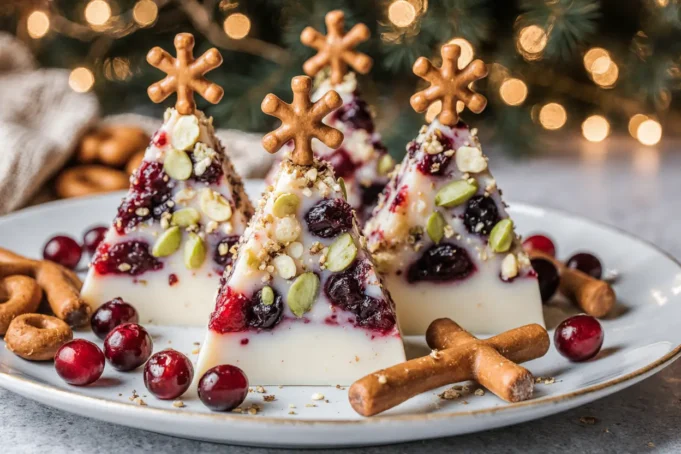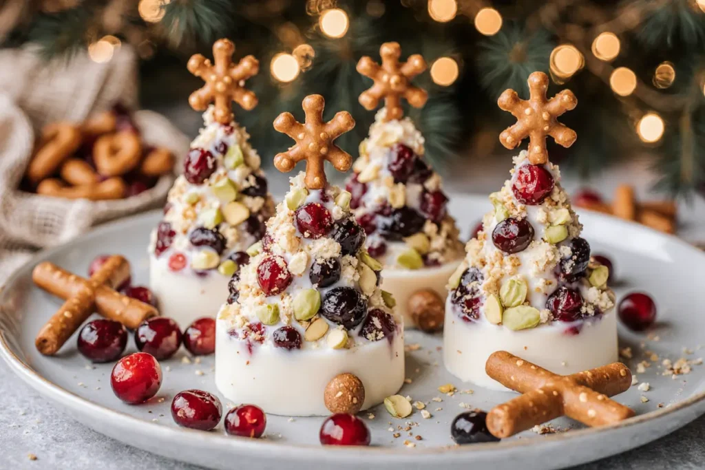 Arrange your cheese trees on a rustic wooden board or slate platter surrounded by an assortment of crackers, including water crackers, rosemary crackers, and gluten-free options. Create “snow” around the base using crumbled feta or shredded coconut. Position small serving knives nearby and provide both regular and gluten-free crackers to accommodate all guests.