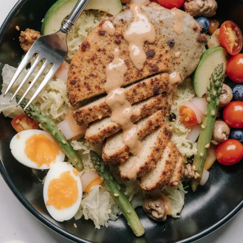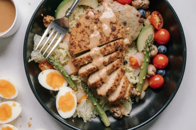 Marination Time: 15-30 minutes (can extend to 4 hours for deeper flavor) Preparation Time: 15 minutes (chopping vegetables, preparing dressing) Cooking Time: 20 minutes (12 minutes for chicken, 8 minutes for eggs) Assembly Time: 5 minutes Total Active Time: 40 minutes Total Time (including marination): 55 minutes to 1 hour 10 minutes