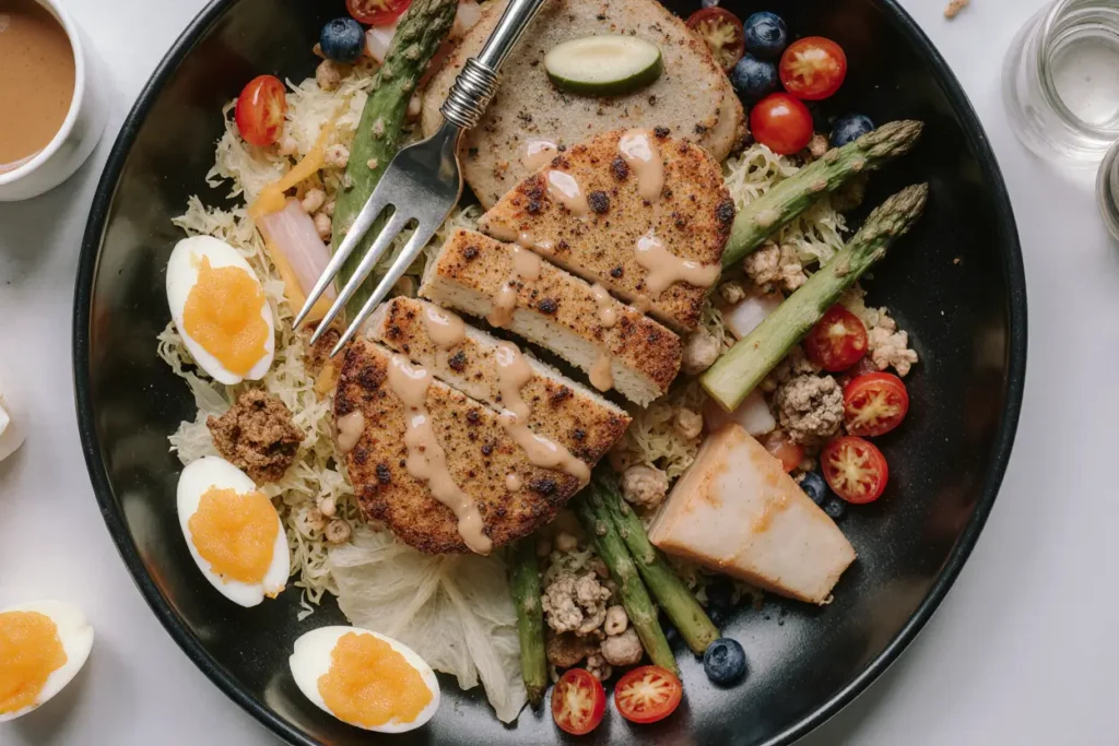 Now comes the moment where all your preparation pays off—the artful assembly of your grilled chicken salad with eggs and veggies. In your large serving bowl containing the chopped romaine, add the cherry tomatoes, cucumber pieces, bell pepper strips, and red onion slices. Toss these vegetables together gently but thoroughly to ensure even distribution. Slice your peeled hard-boiled eggs into quarters or halves—quartering creates more pieces for better distribution throughout the salad. If you’re serving immediately, add about three-quarters of your prepared dressing to the vegetable mixture and toss gently using salad tongs or two large spoons, using a lifting and folding motion rather than stirring, which can bruise delicate lettuce leaves. Ensure every leaf glistens with dressing but isn’t drowning in it. Divide the dressed salad among four serving plates or bowls, creating a bed for your protein. Arrange the sliced grilled chicken on top of each portion, fanning it out attractively. Place the egg quarters strategically around the chicken. If using avocado, slice it just before serving to prevent browning, and arrange the slices alongside the eggs. Sprinkle with crumbled feta cheese if using, scatter sunflower seeds or your chosen nuts for crunch, and finish with a scattering of fresh herbs. Drizzle any remaining dressing over the top or serve it on the side for those who prefer extra creaminess. For meal prep, keep all components separate: store the dressed vegetables in one container, chicken in another, eggs in another, and dressing separately, then assemble just before eating to maintain optimal texture and freshness.