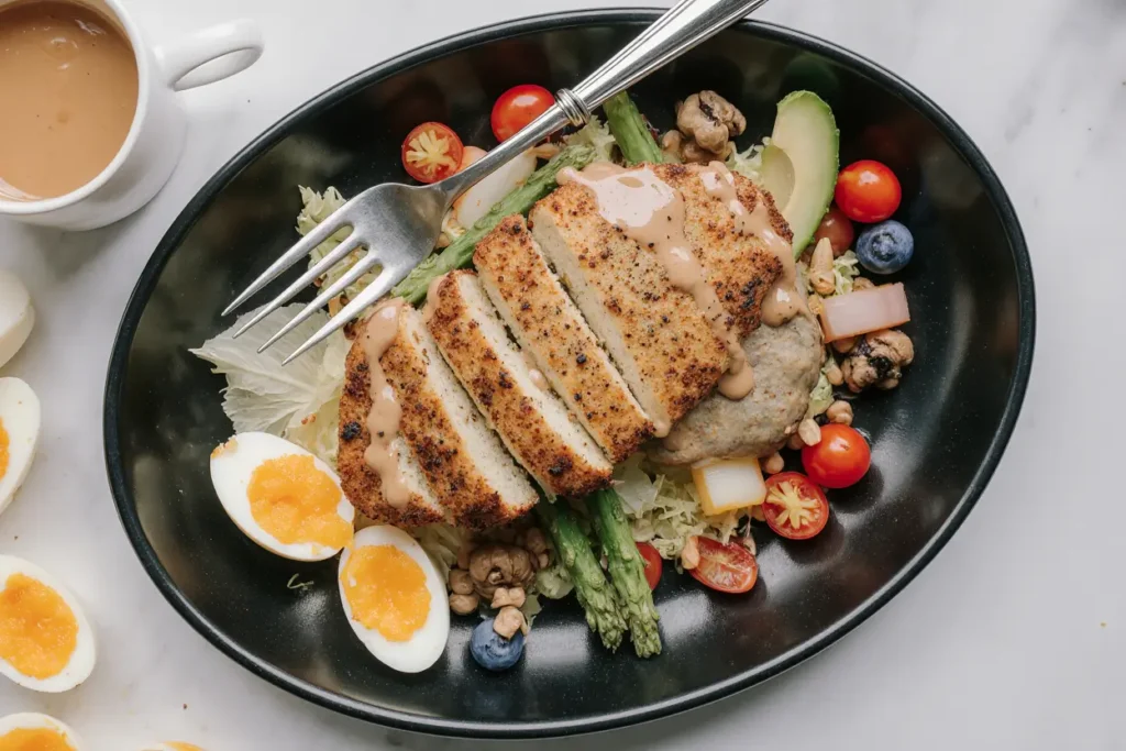 Party Platter: For entertaining, arrange the components separately on a large platter—lettuce bed in the center, surrounded by mounds of chicken, vegetables, eggs, and toppings, with the dressing in a small bowl alongside. This “build-your-own” presentation encourages guests to customize their portions and creates an interactive dining experience.