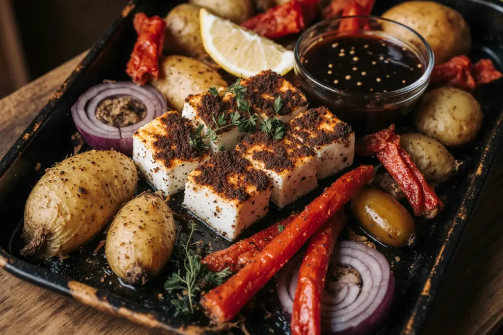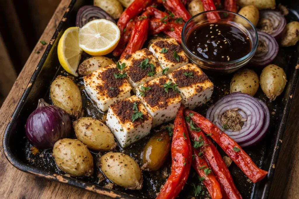 Q: Can I use regular cheese instead of halloumi? A: While halloumi’s high melting point makes it ideal for roasting, you can substitute with paneer (Indian cottage cheese) or thick slices of feta. Regular mozzarella or cheddar will melt completely, changing the dish’s texture significantly. If using feta, add it during the last 5 minutes only.