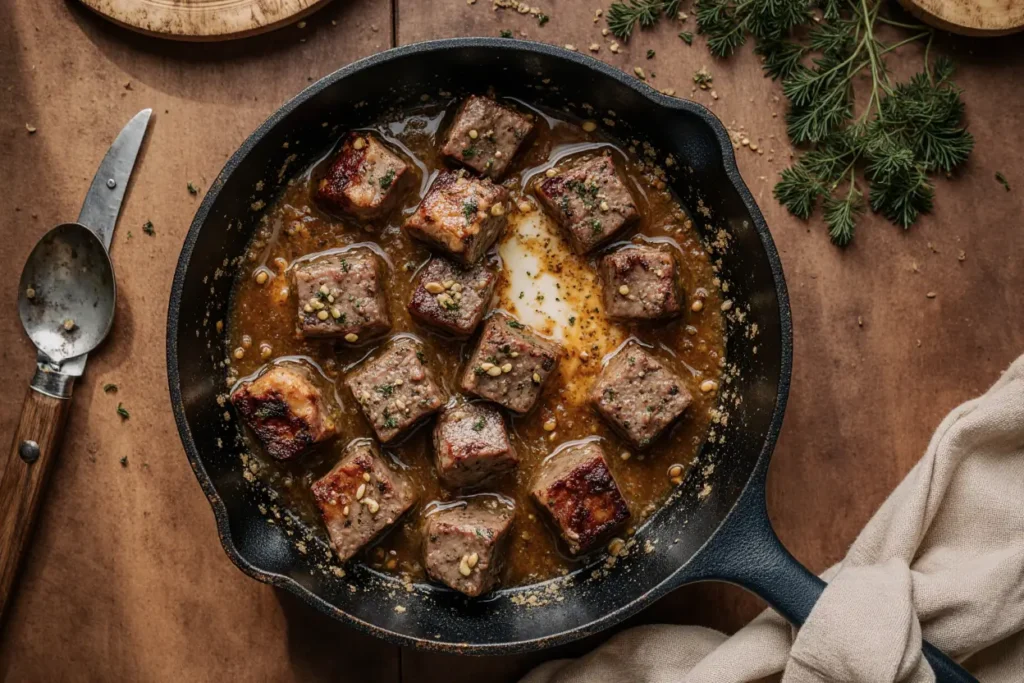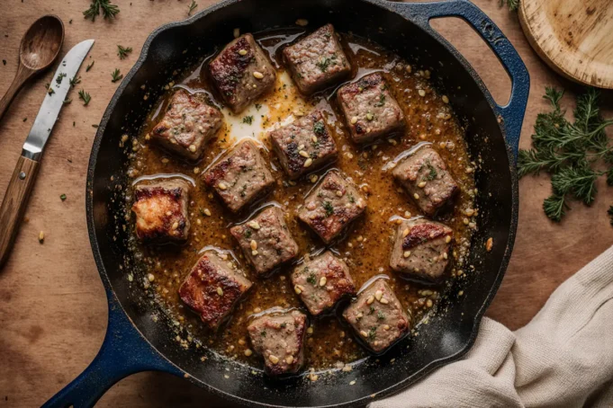 Reduce the heat to medium-low. Push the steak bites to the edges of the pan and add the butter to the center. As it melts and begins to foam, add the minced garlic and fresh thyme. Stir gently for about 30 seconds to 1 minute, until the garlic is fragrant and golden — but not brown. Burnt garlic turns bitter quickly, so keep a watchful eye.