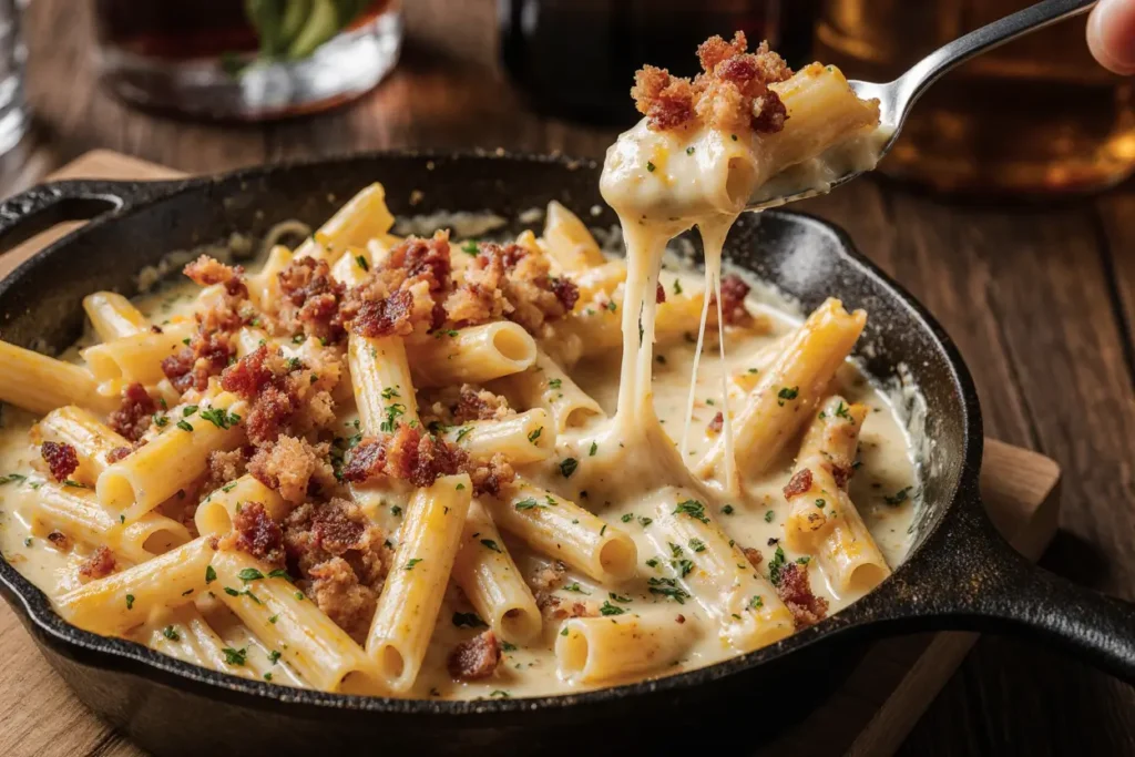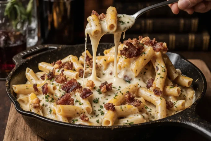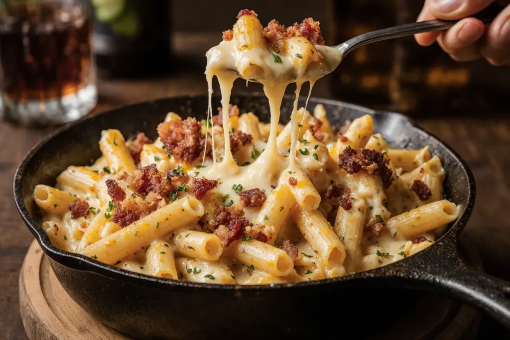 What’s the best pasta shape for this recipe? Penne and rigatoni work exceptionally well because their tubular shapes with ridges catch and hold the thick, creamy sauce while providing structural integrity that won’t become mushy. Other excellent options include cavatappi (corkscrew pasta), shells that cup the sauce, or fusilli whose spirals trap bits of bacon and beef. Avoid delicate shapes like angel hair or thin spaghetti, which can’t support the hearty sauce and tend to clump. Short, sturdy pasta shapes with texture perform best, creating the ideal fork-full with sauce, meat, and toppings in every bite.