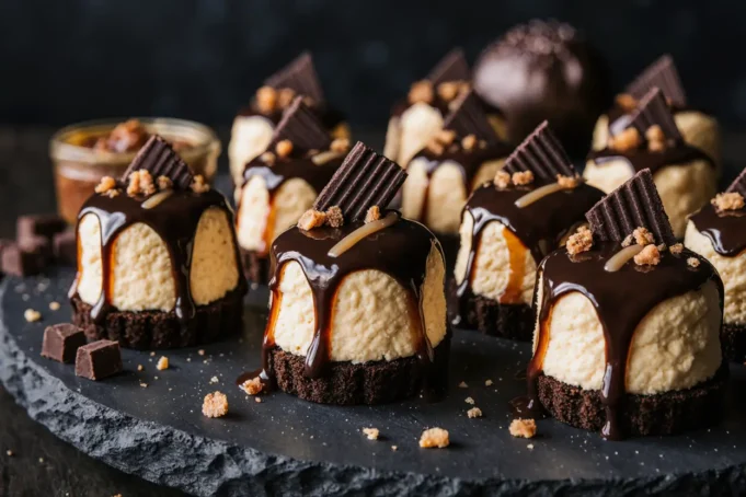 Present these Mini Chocolate Caramel Cheesecake Bites on elegant dessert platters garnished with fresh mint leaves, edible flowers, or scattered cacao nibs for restaurant-quality visual appeal. Arrange them in decorative patterns—circular displays work beautifully for buffets, while linear arrangements suit formal dinner party presentations. Serve alongside espresso shots or specialty coffee drinks for sophisticated pairings that complement the rich, sweet flavors; the bitter notes in coffee create perfect balance against the caramel’s sweetness.