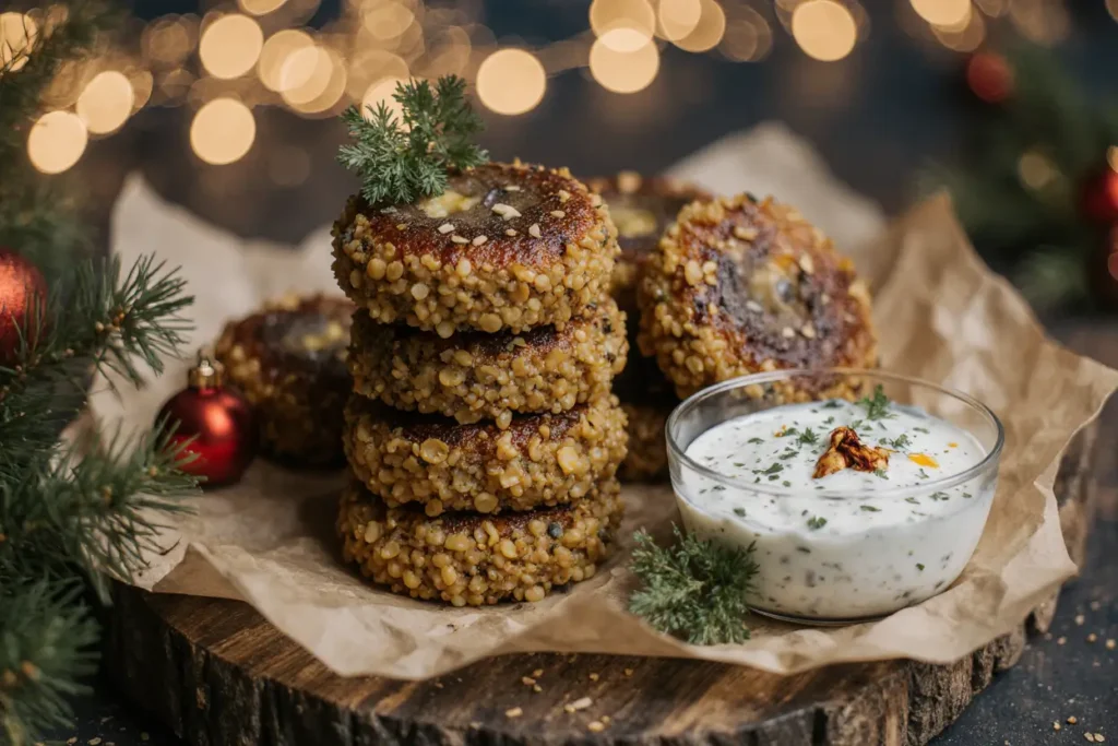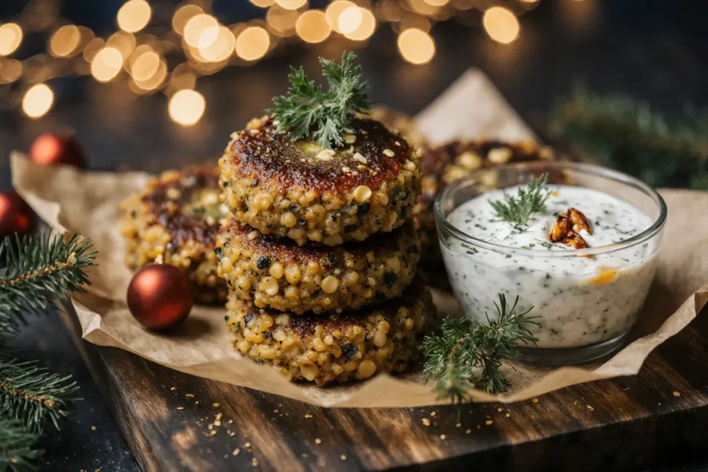 Arrange the warm, crispy patties on a serving platter around the bowl of creamy dip. Garnish the platter with lemon wedges, fresh herb sprigs, and perhaps some cherry tomatoes or cucumber slices for color and freshness.