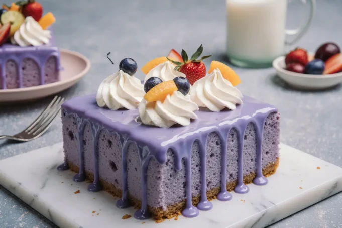 Spread the ube whipped cream evenly over the chilled cake using an offset spatula, creating swirls and peaks for visual interest. The contrast between the deep purple cake and lighter lavender cream creates that Instagram-worthy aesthetic that’s made this dessert go viral. Garnish with white chocolate shavings for elegant contrast, toasted coconut flakes for tropical flair, or fresh edible flowers for a touch of sophistication. For maximum impact, slice with a sharp knife dipped in hot water and wiped clean between cuts—this creates those picture-perfect, clean-edged slices that showcase the cake’s gorgeous layers and milk-soaked interior.