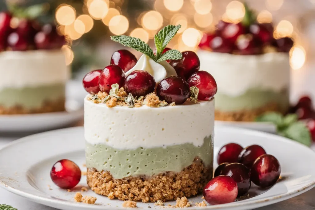 Use vegan digestive biscuits with coconut oil instead of butter for the base. Replace cream cheese with cashew cream cheese (blend soaked raw cashews with lemon juice, vanilla, and a touch of nutritional yeast for tang). Use coconut cream (the solid part from a chilled can of full-fat coconut milk) instead of dairy cream. The result is remarkably close to the original, with a subtle coconut undertone that actually complements the mint beautifully.