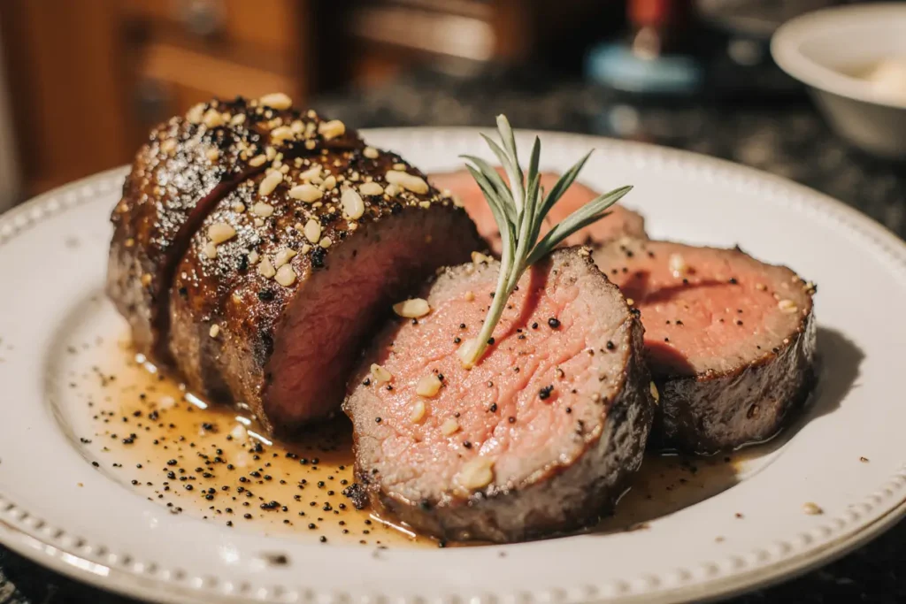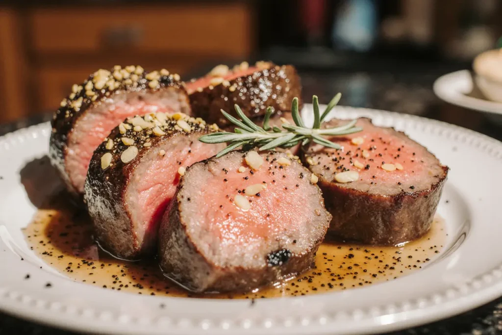 Q: Can I use this recipe for individual filet mignon steaks? A: Yes, with timing adjustments. Use the same seasoning approach, but sear filets 3-4 minutes per side in the hot pan, then transfer to a 400°F oven for 5-8 minutes depending on thickness and desired doneness. The smaller mass of individual steaks cooks much faster than a whole tenderloin, requiring vigilant monitoring to prevent overcooking.