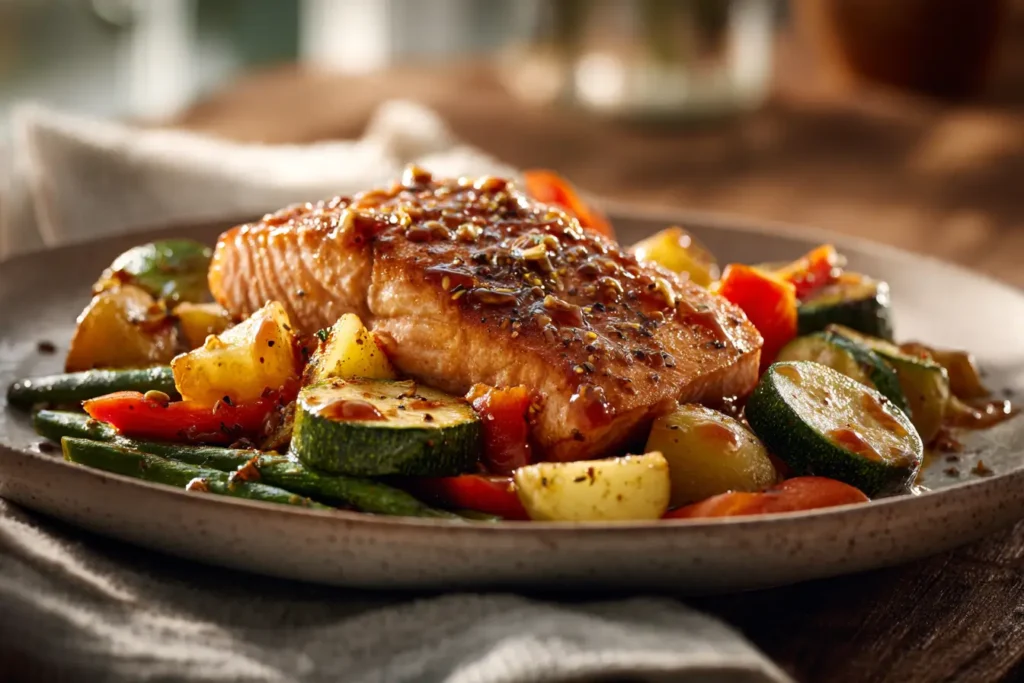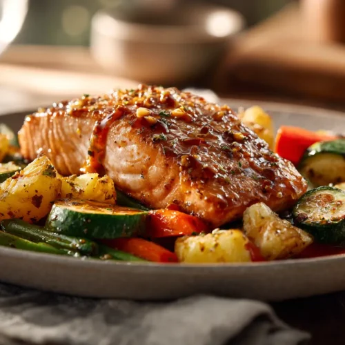 Honey Garlic Salmon with Roasted Vegetables is proof that healthy food doesn’t have to be boring. With its sweet-savory glaze, flaky texture, and colorful roasted vegetables, this dish satisfies cravings while supporting a balanced lifestyle.