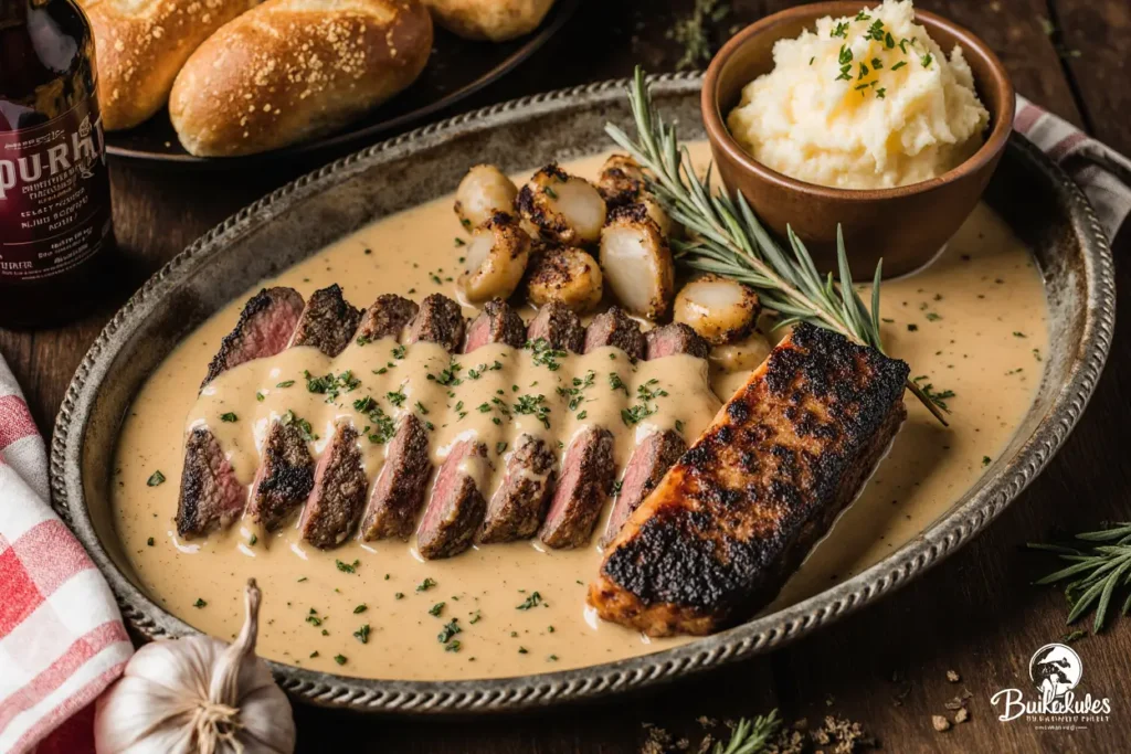 Classic Steakhouse Style: Pair your Spooky Garlic Bourbon Steak with creamy mashed potatoes whipped with roasted garlic and a touch of buttermilk. Add sautéed green beans almondine for a textural contrast—the crisp beans and crunchy almonds balance the tender, rich steak beautifully.