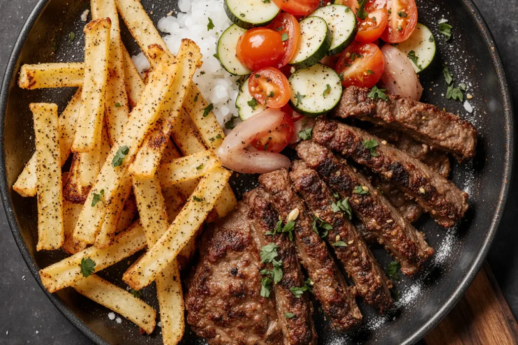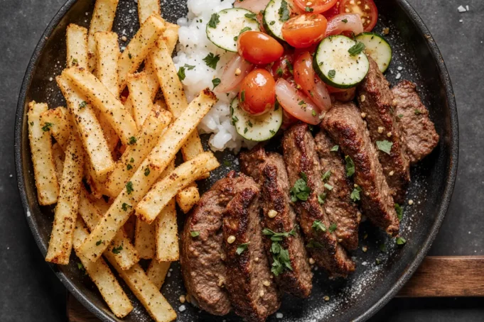 Juicy, seasoned steak fajitas served alongside crispy golden fries and a bright tomato cucumber salad—this is the kind of meal that satisfies every craving on the table. It’s hearty yet refreshing, bold yet balanced, and incredibly simple to prepare. Whether you’re cooking for family dinner, hosting a casual gathering, or just treating yourself to a restaurant-quality meal at home, this Steak Fajitas with French Fries & Tomato Cucumber Salad recipe delivers flavor, texture, and comfort in every bite.