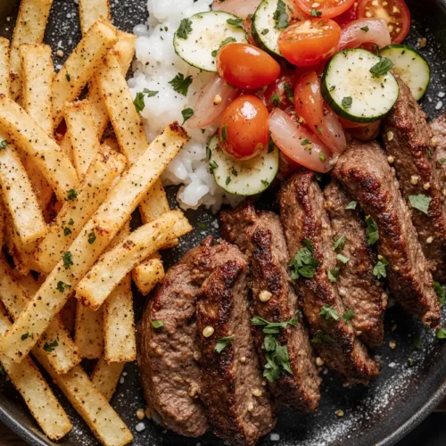 This dish combines tender flank or skirt steak, seared to perfection with smoky spices, vibrant bell peppers and onions, crispy fries for that indulgent crunch, and a refreshing salad that cuts through the richness beautifully. It’s a complete, crowd-pleasing plate that feels special without requiring complicated techniques.