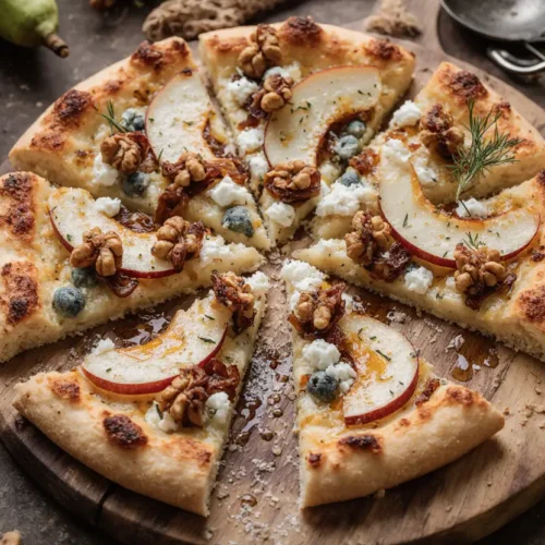 Sweet Pear & Blue Cheese Pizza Night transforms ordinary home cooking into an extraordinary culinary experience that balances sophisticated flavors with accessible technique. This recipe proves that gourmet doesn’t require complexity—just quality ingredients thoughtfully combined. The caramelized sweetness of pears, the tangy punch of blue cheese, the peppery freshness of arugula, and the nutty crunch of walnuts create a harmonious symphony of flavors that elevates pizza beyond its casual reputation.
