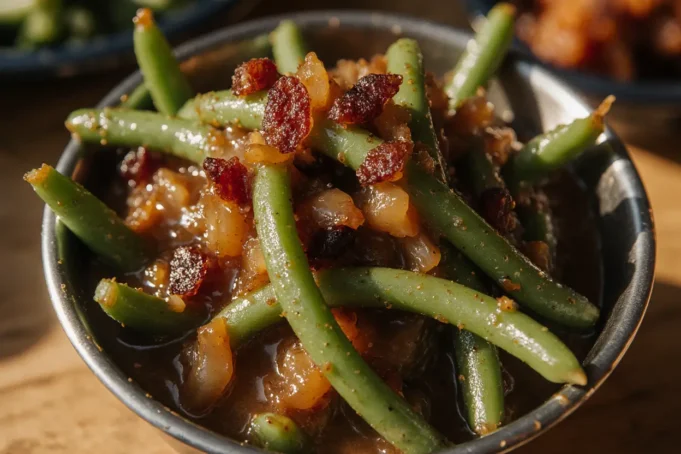 Transfer the green beans to a serving dish and top with the reserved crispy bacon pieces. For an extra touch of richness, you can drizzle with an additional tablespoon of melted butter right before serving. The beans should glisten with that signature restaurant-quality sheen.
