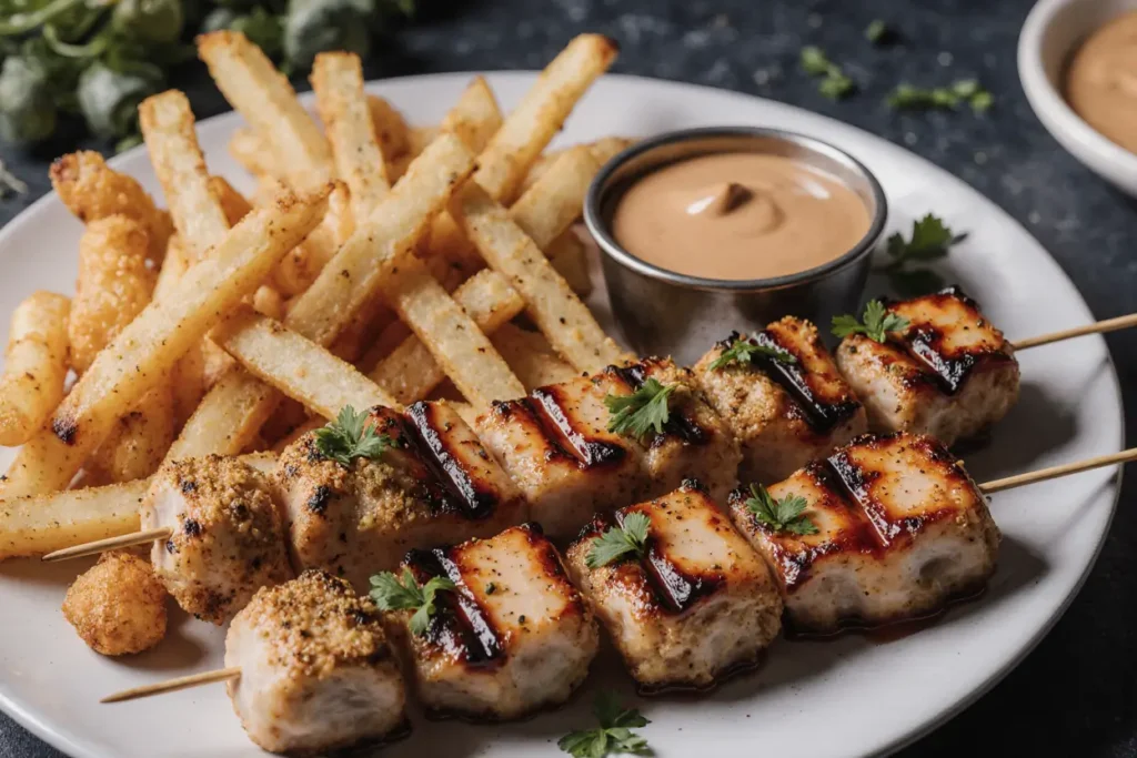 Modern Bowl Style: Create a deconstructed bowl with cauliflower rice, shredded cabbage, edamame, and julienned carrots. Drizzle with peanut sauce and top with skewers for an Instagram-worthy presentation.