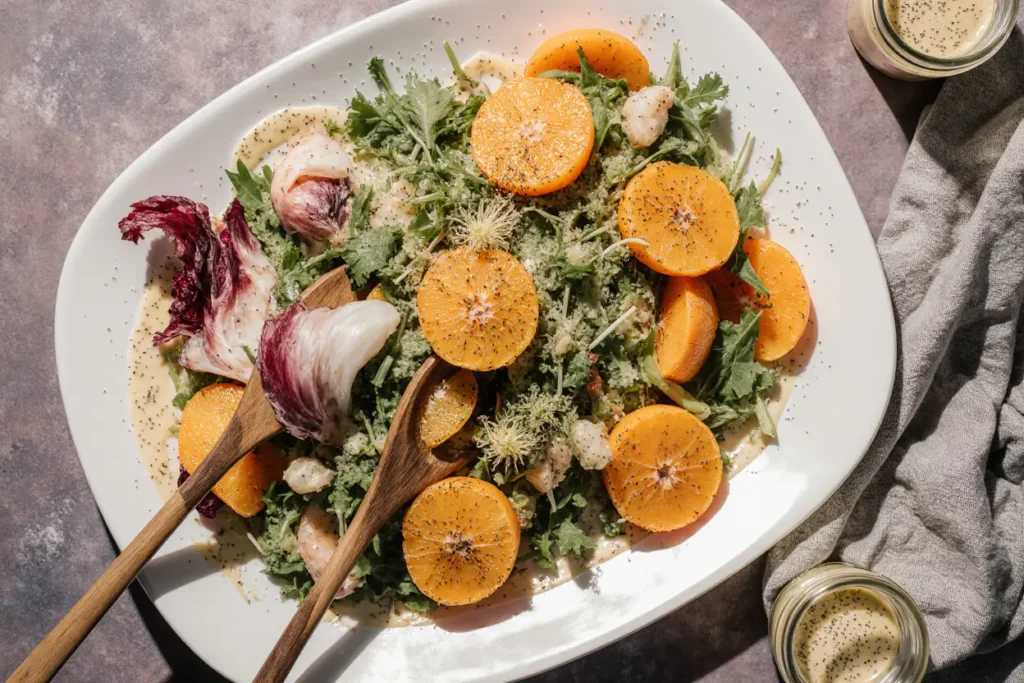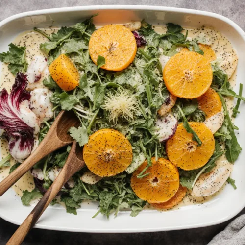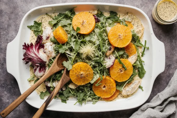 Can I make this salad ahead for a party? Absolutely! Prepare all components up to 24 hours in advance: wash and store greens, supreme oranges, make dressing, and prep other ingredients. Store everything separately in the refrigerator. About 5-10 minutes before guests arrive, assemble and dress the salad for that just-made freshness and perfect texture. For very large gatherings, consider setting up a “salad bar” with components in separate bowls, allowing guests to build their own portions—this keeps everything at peak freshness throughout the event.