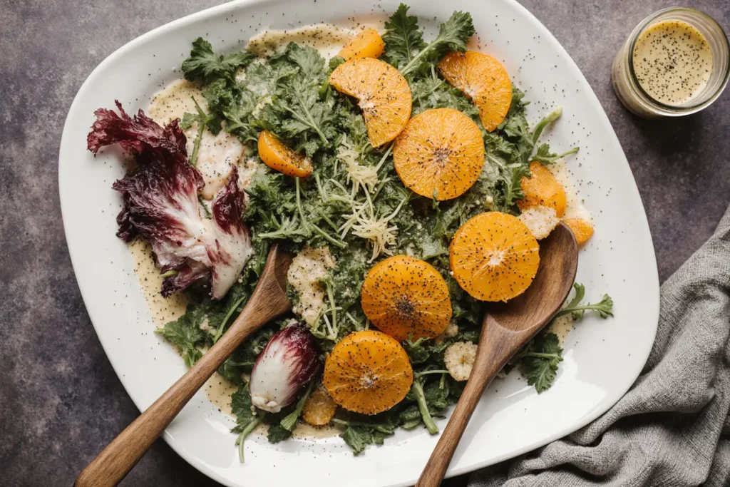 In a small bowl or jar, combine the fresh lemon juice, 2 tablespoons of the reserved orange juice, extra virgin olive oil, honey, sea salt, and black pepper. Whisk vigorously for 30 seconds until the mixture emulsifies into a unified, slightly thickened consistency—you should see no separation between the oil and citrus. The honey acts as both a natural emulsifier and a strategic sweetness that creates harmony with the bitter leaf. Taste and adjust: if the dressing seems too tart, add another 1/2 teaspoon of honey; if it needs more brightness, add a splash more lemon juice. The perfect dressing should taste balanced on its own, with noticeable sweetness, acidity, and a pleasant saltiness.